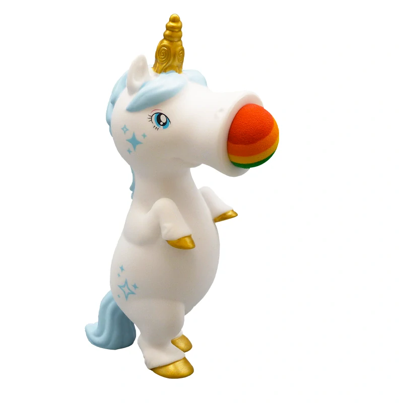 Nechte se okouzlit naším kouzelným Plopáčkem Jednorožcem. V rukou malé princezny se roztomilý jednorožec promění v opravdovou kouzelnou „zbraň“. Měkký pěnový míček v barvách duhy stačí vložit do tlamy plopáčka, zamířit na terč (ke hře je dostupný speciální houpací lepivý terč) a rychlým, silným stiskem vyslat duhový míček na magickou cestu až do vzdálenosti 6 metrů.